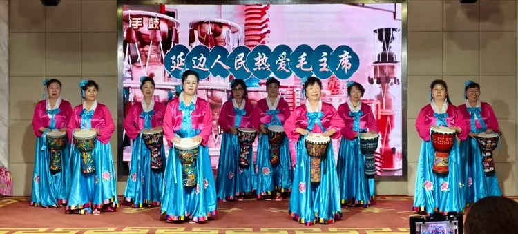 手鼓表演《延边人民热爱毛主席》手鼓节奏欢快,鼓点清脆,舞者动作整齐,热情传递对毛主席的热爱与民族风情。