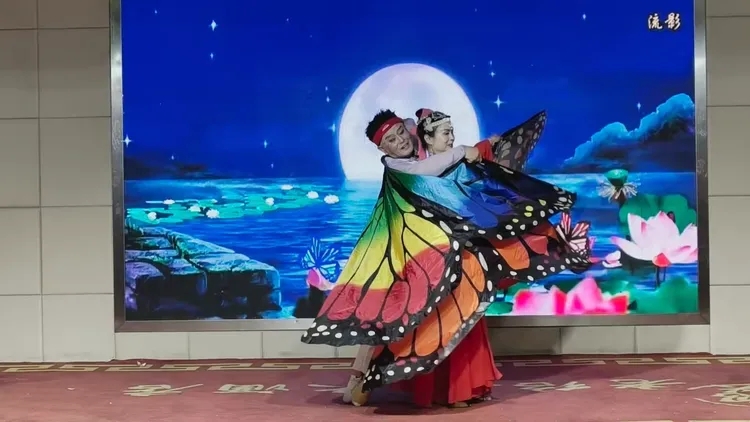 双人舞《化蝶》亮亮与舞伴似蝶起舞,默契配合,借流畅动作诠释梁祝生死相依的凄美爱情。