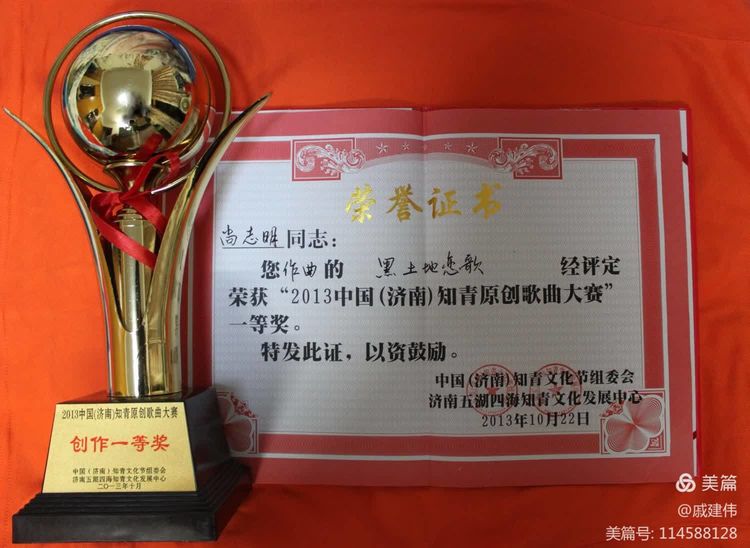 2013年,知青歌曲《黑土地恋歌》获第十届中国艺术节“2013中国(济南)知青原创歌曲大赛”作曲一等奖