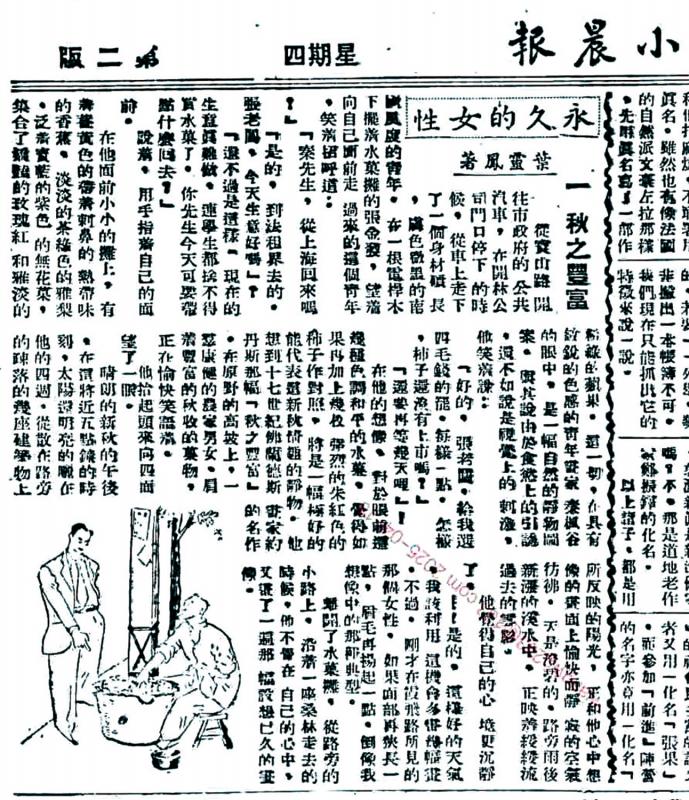 “从宝山路开往市政府的公共汽车,在开林公司门口停下的时候,从车上走下了一个身体颀长,肤色微黑的南国风度的青年。”这是叶灵凤一九三五年九月为《小晨报》所写的长篇小说《永久的女性》开篇第一句。小说主人公是画家秦枫谷,从鲁少飞的《文坛茶话图》上看,叶灵凤本人算得上“身体颀长”,是否“肤色微黑”则不得而知,然而,叶先生出身上海美术专科学校,也是一位画家确定无疑。读这部讲青年画家在艺术与人生困惑中的小说,我不时联想起作者的经历也不算奇怪,小说中多次出现的宝山路、江湾路和北四川路等,本也是叶灵凤当年的生活之地。