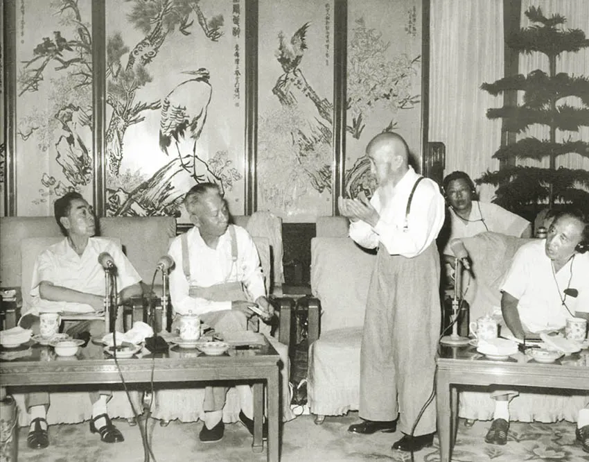 ◆1960年,周恩来(左一)、刘少奇(左二)与沈钧儒(左三)等党外人士座谈交流。