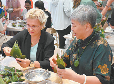 李檀雅(左一)在蛇口街道组织的活动中学习包粽子。 受访者供图