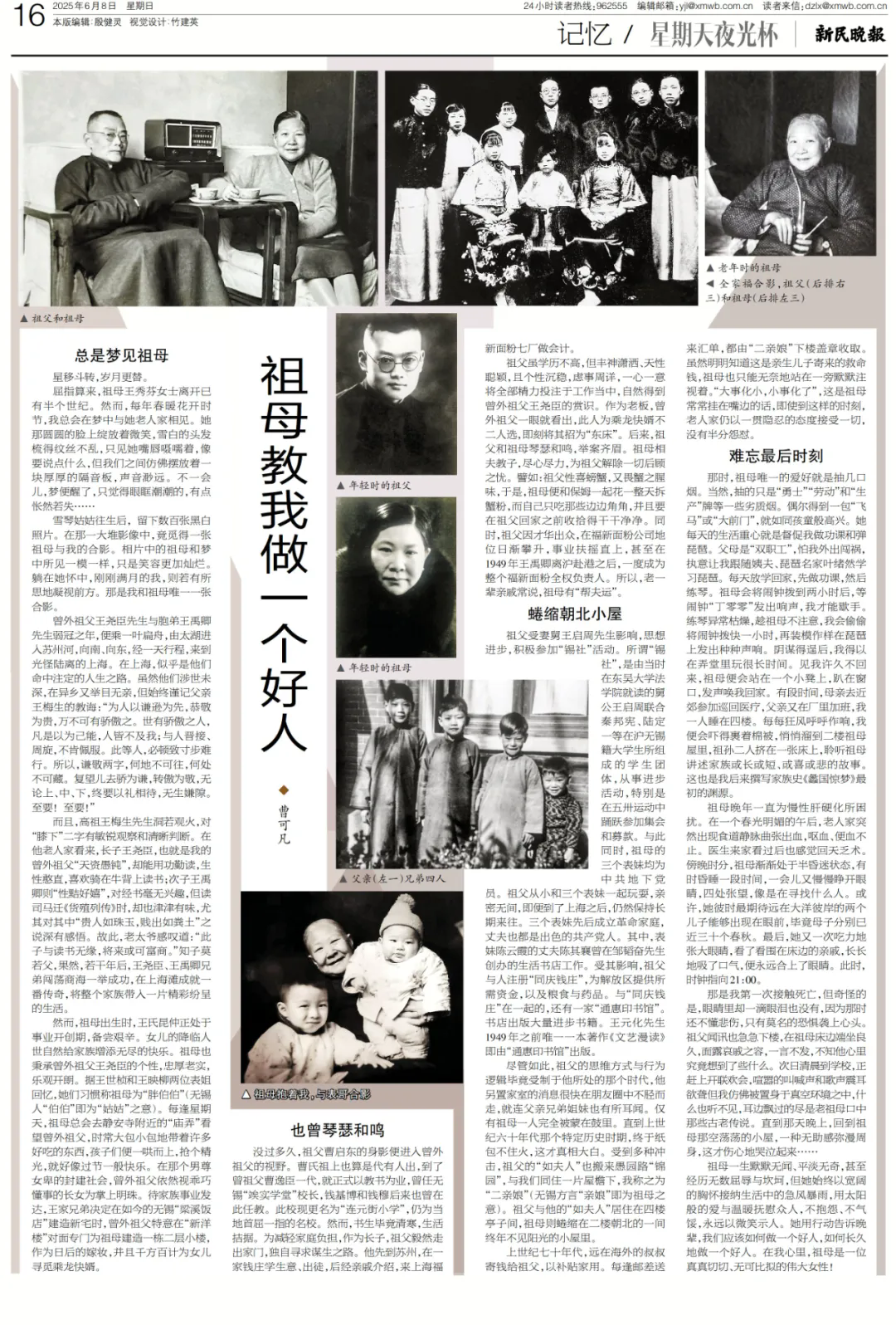 然而,祖母出生时,王氏昆仲正处于事业开创期,备尝艰辛。女儿的降临人世自然给家族增添无尽的快乐。祖母也秉承曾外祖父王尧臣的个性,忠厚老实,乐观开朗。据王世桢和王映柳两位表姐回忆,她们习惯称祖母为“胖伯伯”(无锡人“伯伯”即为“姑姑”之意)。每逢星期天,祖母总会去静安寺附近的“庙弄”看望曾外祖父,时常大包小包地带着许多好吃的东西,孩子们便一哄而上,抢个精光,就好像过节一般快乐。在那个男尊女卑的封建社会,曾外祖父依然视乖巧懂事的长女为掌上明珠。待家族事业发达,王家兄弟决定在如今的无锡“梁溪饭店”建造新宅时,曾外祖父特意在“新洋楼”对面专门为祖母建造一栋二层小楼,作为日后的嫁妆,并且千方百计为女儿寻觅乘龙快婿。