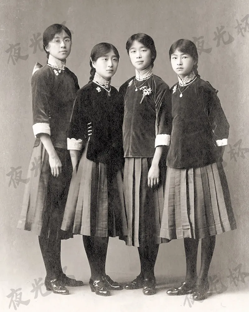 1916年,林徽因与表姊妹们身着培华女子中学校服合影。左起:王孟瑜、王次亮、曾语儿、林徽因