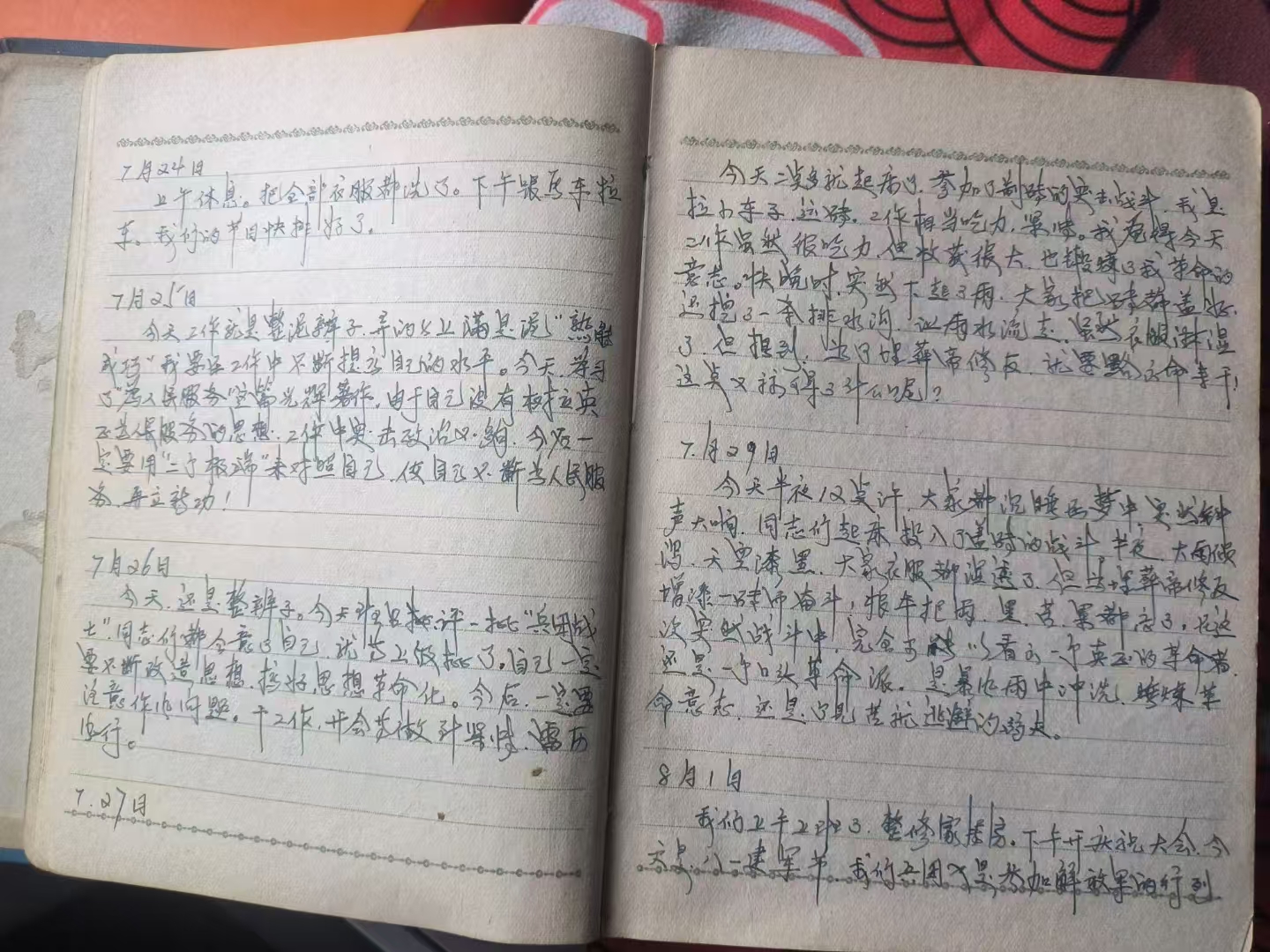 边开荒,边军训,时刻准备打仗,一切显得紧张而又有序。为了及时把握知青们的思想动态,无论是从哪来的知青,成为了兵团战士,就必须每天记红色日记,指导员将会每周检查一次。