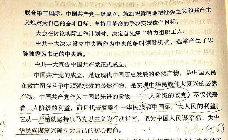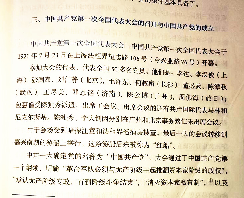 然而书中后面就不再继续这样讲。第7段明确指出“中共一大宣告中国共产党正式成立”后。第8段这样点明中国共产党成立的必然性和中国共产党的初心使命。文中说。中国共产党成立是三个“必然产物”。即“是近现代历史发展的必然产物,是中国人民在救亡图存斗争在顽强求索的必然产物,是实现中华民族伟大复兴的必然产物”笔者认为这三个“必然产物”没有错误,但不完全,缺一个最主要最根本的“必然产物”即“是中国工人阶级和中华民族反对帝国主义、封建主义、官僚资本主义的阶级斗争实践的必然产物”。马克思恩格斯的《共产党宣言》及《共产主义者同盟》的成立就是欧洲三大工人运动中欧洲无产阶级反对资产阶级阶级斗争的必然产物。中国共产党自然也是中国的无产阶级和人民群众的阶级斗争的必然产物。不讲阶级斗争的必然产物,就不可能真正讲清楚中国共产党人的阶级基础。而本段结尾就非常直白地这样表述了中国共产党的“初心使命”:“它从一开始就坚持以马克思主义为行动指南,把为中国人民谋幸福,为中华民族谋复兴确立为自己的初心使命”。这里讲“一开始以马克思主义为行动指南”没有错误,但哪来讲“一开始”就“把为中国人民谋幸福,为中华民族谋复兴确立为自己的初心使命”呢?这难道不与第4段中讲的“消灭私有制、消灭阶级、为共产主义事业奋斗”的“初心使命”自相矛盾的吗?不是对一大党纲“初心使命”思想的偏离、修正和篡改吗?