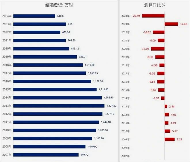 现在我国人口形势之严峻,估计很多人都想不到。一方面,出生人口近几年下降得非常厉害,另一方面,全国各地区年轻人初婚平均年龄越来越大,结婚率逐年走低,据官网报道,2024年结婚登记仅有610万对(见下图),同比下降了20.49%!我心头有一个疑惑,按照实际生育预期,24年950多万新生儿是怎么统计来的???