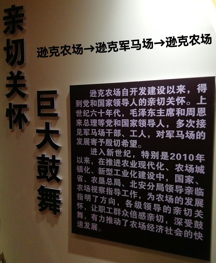 展馆展示许许多多照片和实物,反映第一代复员军官来小兴安岭艰苦奋斗建农场,又变迁为军马场,后又变换农场。尤其是军马场的代表曾被毛主席以及中央领导人的接见,观后动情留下诗一首: