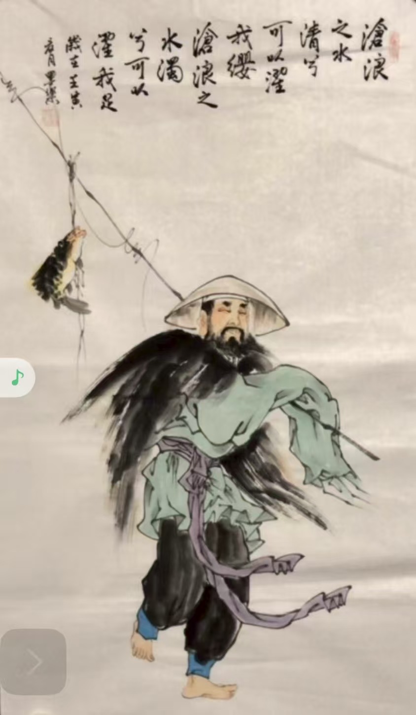 楚国大夫屈原遭到了放逐,这一天来到了沧浪水边,遇一渔夫,渔夫曰,“你不是三闾大夫吗?怎如此落寞?”屈原答曰,“大秦犯边,楚国危机四伏,可国君和众臣却茫然之,世人皆浑浊,我独清,故如此。”渔夫曰:“随波逐流,择机行事,尚好?”屈原曰:“宁葬鱼腹,绝不屈服”。渔夫乃收拾渔具,唱道:“沧浪之水清兮濯我缨,沧浪之水浊兮濯我足。”不再答理屈原,扬长而去。后人认为,如果屈原计从了渔夫,楚国也许不会灭亡。