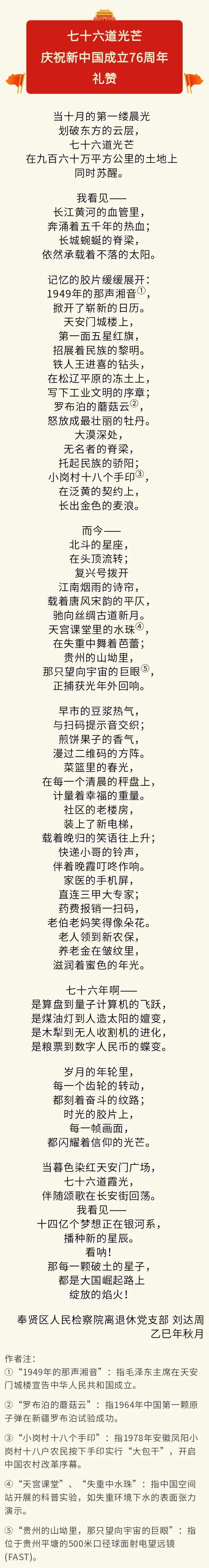 值此金秋时节,欣逢新中国成立76周年华诞,谨献诗篇给伟大的祖国母亲: 愿红旗漫卷映山河,礼炮齐鸣庆太平;华夏大地繁花似锦,九州同庆福寿绵长!