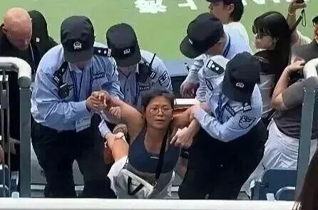 这种情形下,主裁判暂停比赛,对着话筒勒令她安静,谢某反倒更兴奋了,直接掏出一本护照甩在手上挥舞,嘴里喊着“你们管不着我”。