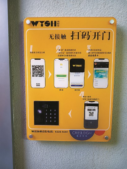 11月底,记者来到帖子里所说的WYSH翡悦里,找到位于园区一层的厕所。此时,男女厕所的门都关着。门口指示牌介绍了开门的四个环节:微信或支付宝扫码—注册翡悦里会员—注册成功后选择“我的会员卡”—弹出二维码,对准门禁扫码开门。