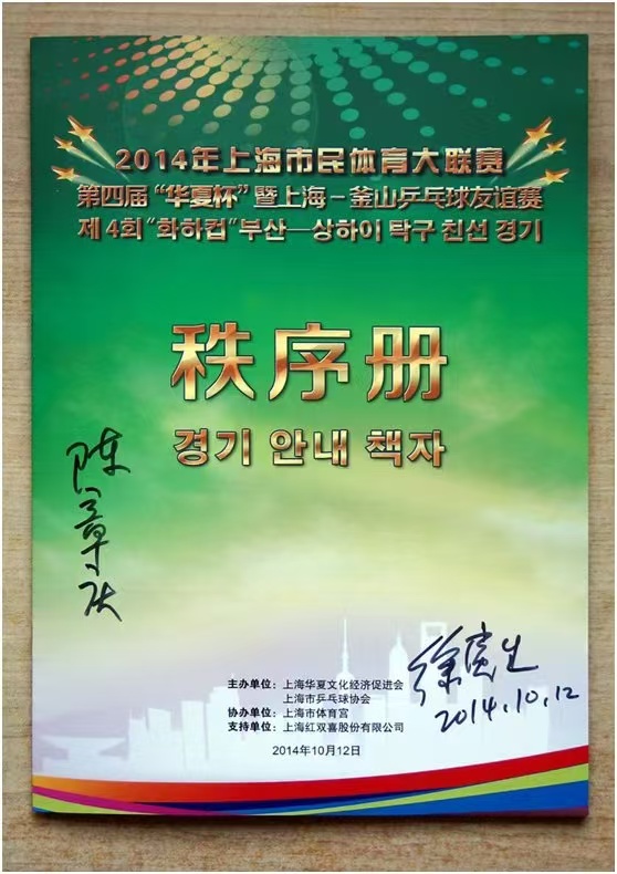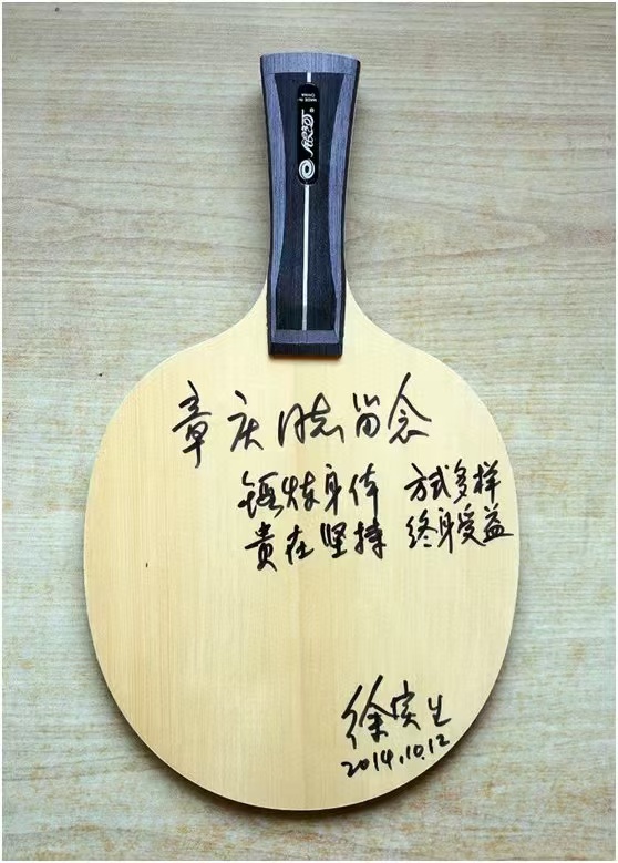 真是机会难得,我也想与他合影留念,要求一提出他立马答应,让我上主席台合影留念。合影有了,签名怎么办?我向主办方提出给整一块,他们口头是答应的但是要等运动员发完后再考虑。为了保险起见,我看到比赛现场有商家在出售运动服和乒乓拍的,于是上前打听价格,好的拍子要1000多元,最便宜的240元,我没有多加思索240元买了一块。当我兴致勃勃拿着拍子去见徐时,他第一句话就是问我多少钱,我说240元,他就说了一句“ 嘎居阁!”(上海话,意思是“这么贵啊!”)。当我表示诚心诚意要请他签字时,徐随即让我告诉姓名,并问想题写些什么内容,我也不加思索地告诉他我是知青,到如今这个年龄希望他对我们这一代人在健康方面提些要求吧!