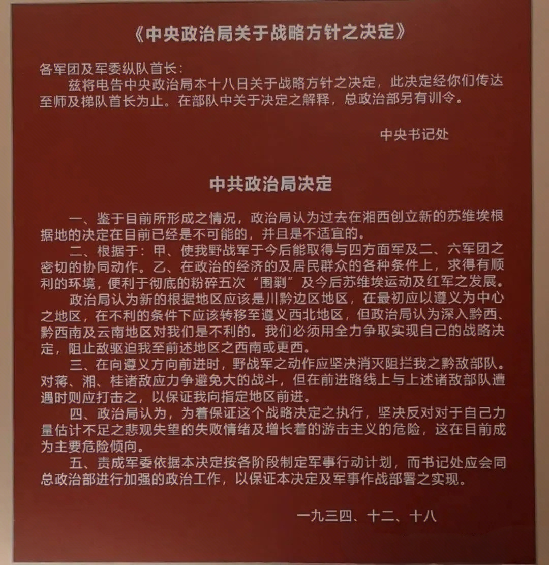 18日,在周恩来主持的中央政治局会议上,秦邦宪与李德(因病未出席但带的口信)再次强调执行原是共产国际的意见北上湘西与红二、六军团会合。毛主席坚决主张继续西进贵州,到川黔边建立根据地,横陈利弊,痛述前非。深有同感的张闻天、王稼祥等多数人都一致支持毛主席的意见,并按毛主席会上的发言写成《中央政治局关于战略方针之决定》,第一次否定了共产国际不切实际的原定北上湘西的计划,继续西进渡过乌江进军敌人控制薄弱的黔北遵义地区。