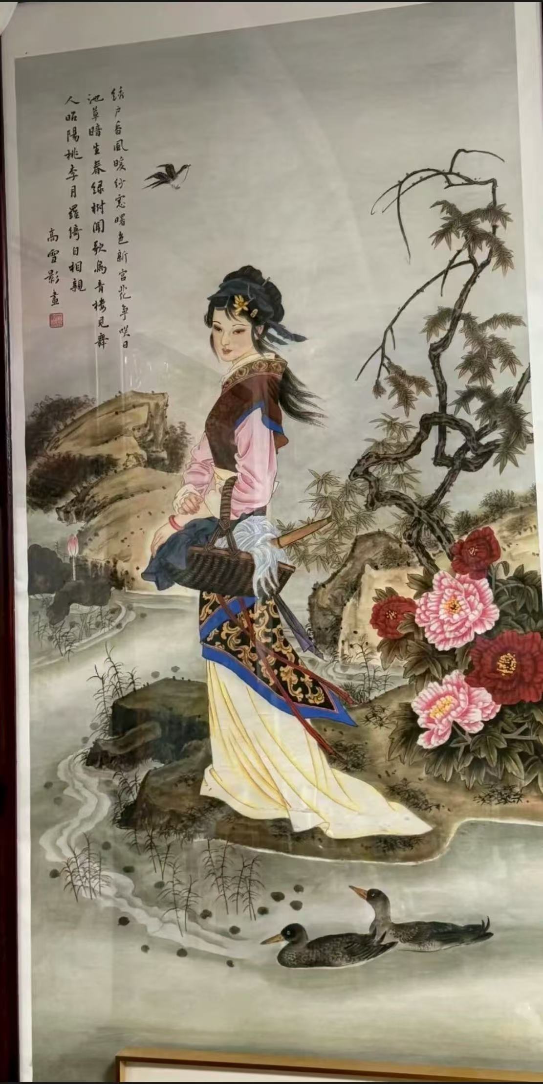 画里的女子手挽竹篮,白纱垂落,立于青石之上。像一缕未散的云,水里的鱼儿醉于她的美貌而沉入水底。她的衣袂被风掀起,明黄的裙裾扫过浅草,与岸边的牡丹相映相望。远处山影淡墨晕染,近处凫鸭拨开水面,落在溪上碎金般的晨光。也落在她的发间。虬枝斜出,新叶如裁,一只飞鸟掠过天际,把一声清啼丢进了这千年的地久天长。