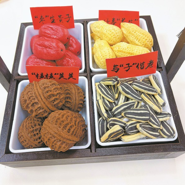 去年一场集团面点大赛,几十位点心师同台竞技。她暗下决心:要拿第一名。下班后,别人都走了,她独自留在食堂反复练习——菠萝酥要酥到掉渣,“枣生贵子”创意面点礼盒要精致好看——红枣是馒头做的,核桃是面团捏的,力求“活脱势像”。功夫不负有心人,“大胖包”一举拿下第一名,成了集团里小有名气的00后点心师,就连领导都默默加入她的包子预订队伍。