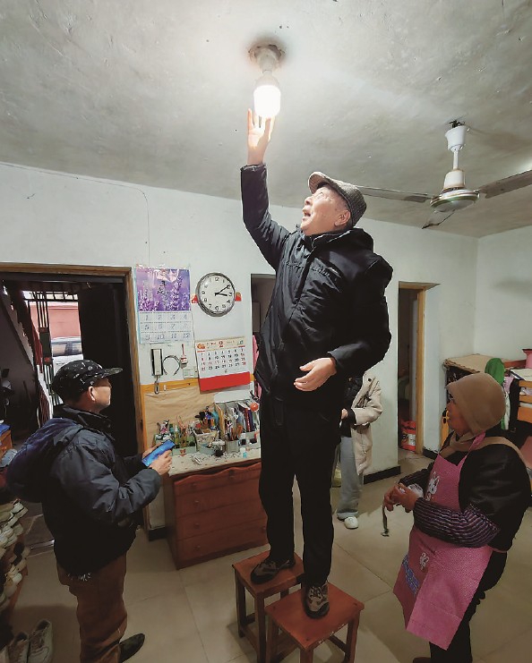 盛长根(右二)上门为居民理发并更换灯泡