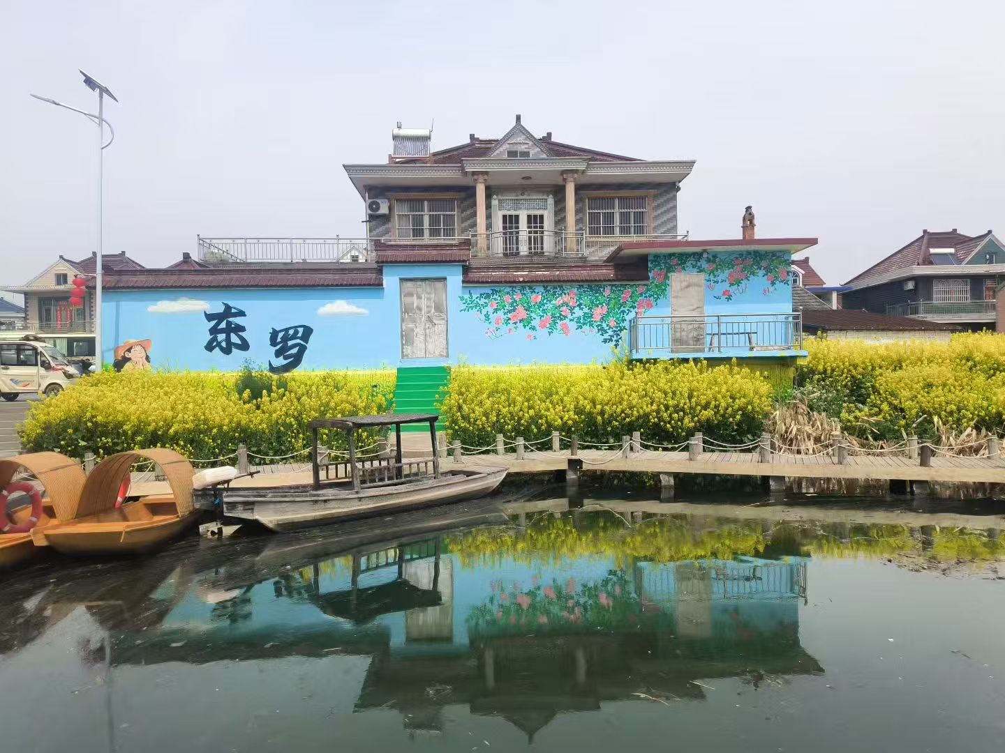 木栈道旁,乌篷船轻系岸边,粉墙黛瓦倒映在清凌凌的水面上,连风里都裹着泥土与菜花的清香。我们在绘着“东罗”二字的蓝墙下留影,在田埂间漫步,看炊烟袅袅,听鸡犬相闻,一派“暧暧远人村,依依墟里烟”的田园诗意。