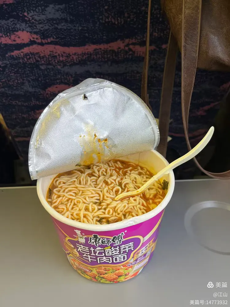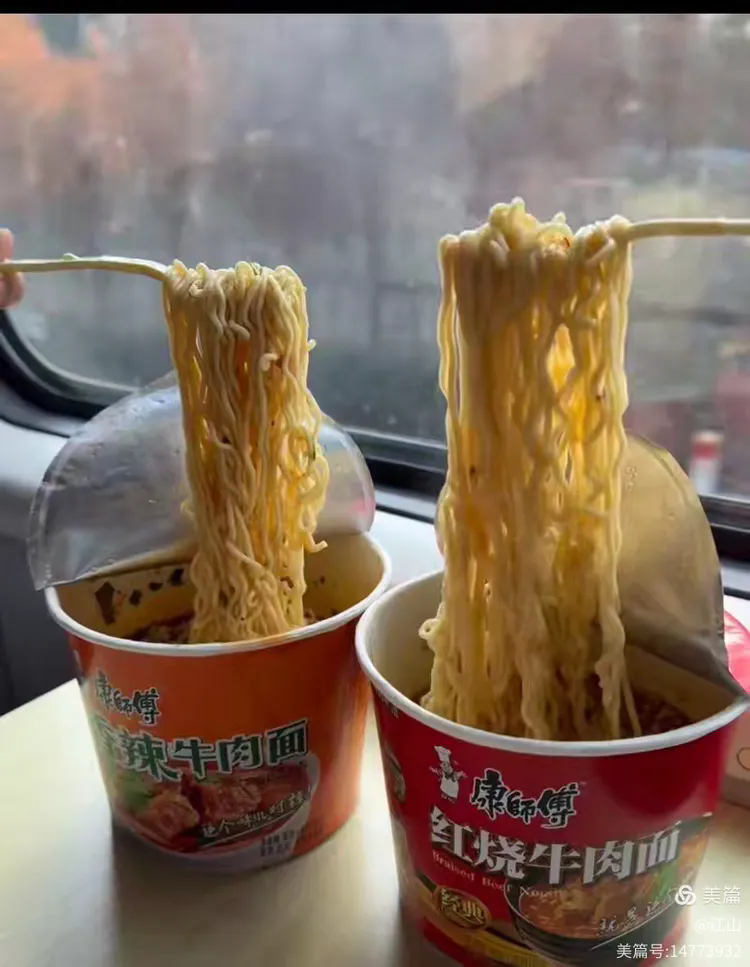 到了吃饭的时候,旅客们纷纷拿出食品来就餐,我们也将碗面拿出来准备用开水冲泡。这时我的同伴就讲;“江师傅,我去帮你泡面。”说完拿起碗面就去找锅炉房。不一会儿,只见他双手端着碗面过来,放在桌子上对我说;“江师傅,面泡好了,你快吃吧。”我说“好的。”过了一会儿,当我将碗面的盖子打开时,发现面饼依旧,用手摸着纸碗,不但没有热气反而冰凉冰凉的。我就问年轻人;“怎么是冷水泡面?”只见他茫然的看着我说;“我不知道水没有烧开的。”看着他一付尴尬的面孔,我也哭笑不得了,只好将碗面里的冷水倒掉,再去找开水泡面。
