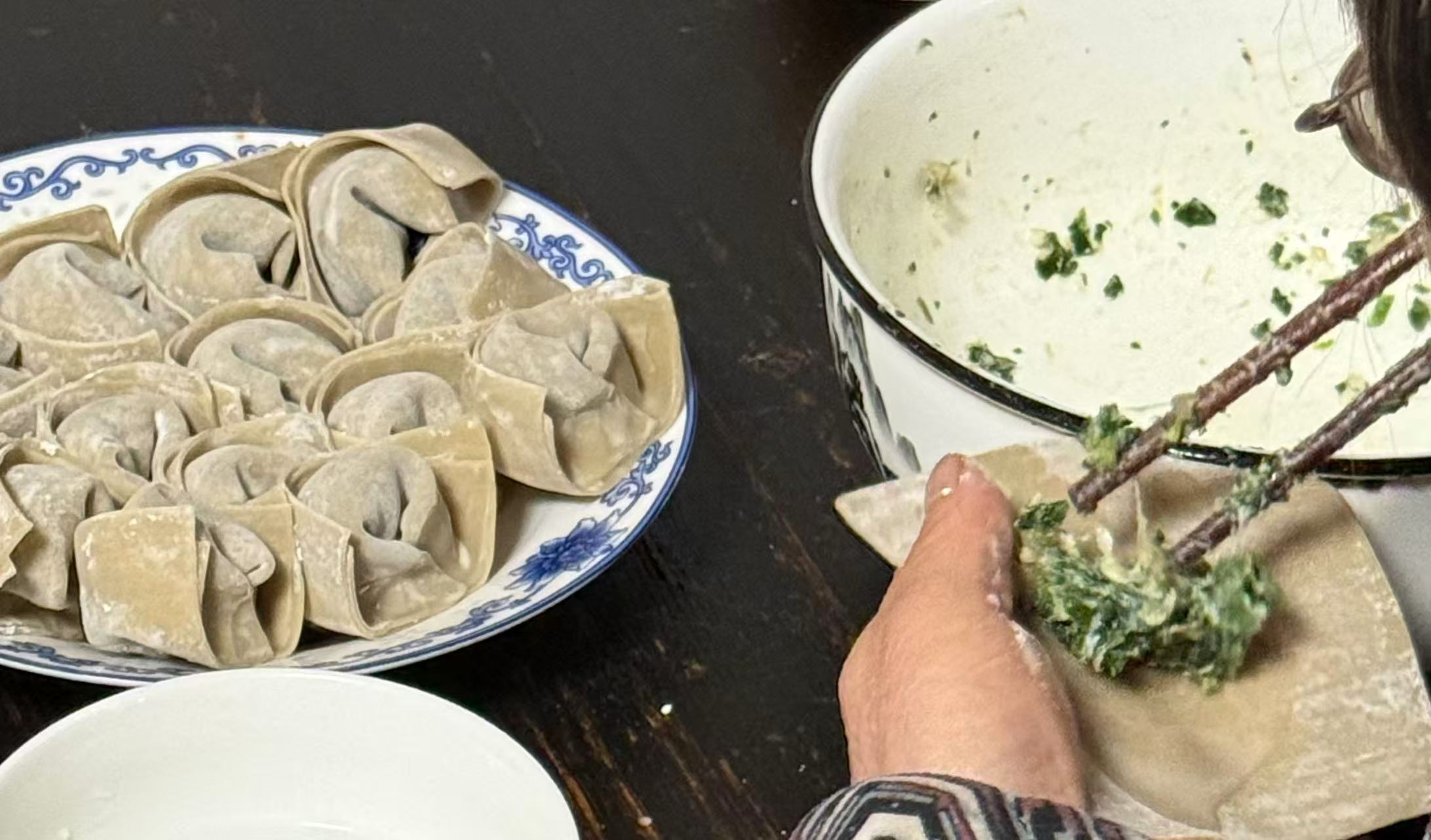 如今光景愈发安稳,菜肉馄饨馅料也愈发丰盛,有时加几颗鲜嫩虾仁,有时添一点剁碎的刀鱼,寻常的馄饨,裹尽了四时鲜味。可无论馅料怎么变,妻包菜肉馄馄的心意始终未改,都不会忘了加许多青菜料。妻说肉是鲜源,而青青的白菜或荠菜却是馄炖的灵魂。细细剁馅,慢慢调味,轻轻包裹,每一个步骤都透着用心,藏着对家人的温柔和责任。