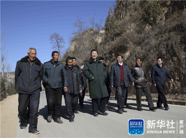 ↑2015年2月13日上午,习近平在延安市延川县文安驿镇梁家河村调研时同村民边走边聊。新华社记者兰红光摄 在北京街头的中式快餐店,他端着盘子,排队买饭,和百姓一起用餐;春节来临,他自办年货,回到插过队的农村看望老乡;他淋着雨同工人交谈,到农民家看谷仓、床铺、灶房、猪圈;他记挂老人,去敬老院不忘查看每日食谱;他关心学生,告诉他们“要扣好人生的第一粒扣子”;地震灾区考察时,他走进帐篷了解安置居民生活,夜深了就在简陋的活动板房中住宿。