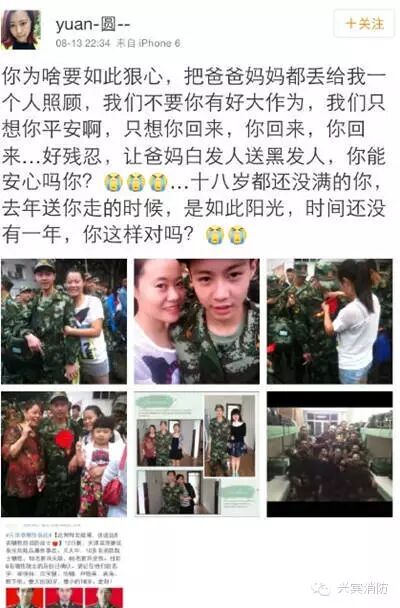 天津爆炸事故中10多名消防战士英勇牺牲。其中最小的还未满18岁,他叫袁海,他的英勇,感动了万千群众,袁海的姐姐在微博里说的话让人有一种无以言表之痛袭来。此刻,任何语言都显得如此苍白! 目前6名确认身份的牺牲战士中,最年轻的消防战士袁海不满18岁。得知弟弟牺牲后,袁海的姐姐在微博里说“我们不要你有好大作为,我们只想你平安啊,只想你回来……”。让网友们看后禁不住心痛落泪,祝福小英雄一路走好。 袁海,生于1997年9月,四川省德阳中江县人,2014年刚入伍,列兵警衔。姐姐和妈妈正赶往天津,据了解,当袁妈妈得知他重伤的消息时,他其实已经牺牲,姐姐还不敢告诉妈妈他已经牺牲。 袁媛在微博上说:“你为啥要如此狠心,把爸爸妈妈都丢给我一个人照顾,我们不要你有好大作为,我们只想你平安啊,只想你回来,你回来,你回来……好残忍,让爸妈白发人送黑发人,你能安心吗你?” 在袁媛微博下方有众多网友留言。网友@小唐要去深圳偷端午说,“袁海是我们镇上的,才18岁的小伙子,入伍不到一年,愿天堂没有灾难,走好小英雄。”也有不少网友表达关心和祝福,“弟弟一路走好!”、“姐姐加油!”“节哀,英雄的姐姐!” 13日晚11时许,袁海姐姐微博回应,“你们的评论,你们的关心,你们的私信,我都看了,原谅我不能一一回复你们,但真的非常感谢你们,相信我弟弟在天堂也会谢谢你们的。” 很多网友表示,看了遇难消防员袁海姐姐yuan-圆-- 的微博,泪奔了。 |