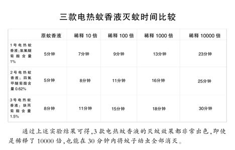 昨日,晨报报道了盘蚊香PM2.5测试结果。除了盘蚊香外,晨报还联手中国科学院上海昆虫博物馆进行了电热蚊香液毒性的测试。测试结果显示,市面上在售的多款电热蚊香液灭蚊效果都很“犀利”,稀释10000倍后蚊子幼虫仍然扛不过30分钟。对蚊子有如此大的杀伤力,那对人体健康又是否有害呢? 实验采用国家标准的蚊虫抗药性检测方法,以此反映电热蚊香液的毒性。 实验人员先取1毫升含1%氯氟醚菊酯的1号电热蚊香液,加入盛有149毫升脱氯自来水的器皿中,用玻璃棒搅匀。把另一杯中预先挑选好的30条活体蚊子幼虫、连同50毫升水,全部注入上述器皿中,合计200毫升溶液,同时开始计时。随着时间的流逝,可以看到器皿中的蚊子幼虫逐渐开始抽搐,部分幼虫开始纷纷往水底沉去,到达一定时间后,所有幼虫都已经失去了活性,用搅拌棒拨动也没有任何反应,即已经全部死亡,此时记录时间。 随后,把1号电热蚊香液分别稀释10倍、100倍、1000倍、10000倍,并分别取稀释后的电热蚊香液1毫升,分别加入4个盛有149毫升脱氯自来水的器皿中,以同样的方法进行实验,逐一记录蚊子幼虫全部死亡所需的时间。1号电热蚊香液实验完成后,再以同样的方法对2号电热蚊香液、3号电热蚊香液进行实验,分别记录时间。 电热蚊香液睡前1-2小时使用 记者发现,市面上在售的品牌电热蚊香液,基本上都会以每晚使用8小时的标准,标明可使用的天数。如记者购买的用于实验测试的1号、2号、3号电热蚊香液,一盒均为2瓶装,分别可使用100晚、112晚、90晚,使用一个夏天可以说绰绰有余。 中国科学院上海植物生理生态研究所昆虫博物馆高级工程师袁建忠介绍说,在通风环境下,可按照厂家推荐的连续使用7至8小时。但一般来说,电热蚊香液在1到2小时内就可以杀灭房间内的蚊子,所以不建议市民长时间使用,特别应该尽量避免彻夜使用。“我们之前对盘蚊香和电热蚊香液都做过实验,把盘蚊香和电热蚊香液分别放在玻璃房里使用,投入100只蚊子,观察蚊子的死亡情况。实验结果表明,盘蚊香和电热蚊香液的灭蚊效果都是比较好的。合格的盘蚊香在20到30分钟内蚊子全部落地,合格的电热蚊香液在1到2小时内蚊子全部落地。所以,市民在使用电热蚊香液驱蚊时,可以在睡前1到2小时左右将蚊香液通电,并关好门窗,临睡时再将窗户打开通风,同时关好纱窗。” 出现不明原因头晕立即停止使用 从市面上售卖的电热蚊香液来看,它和盘蚊香中的灭蚊药物基本相同,只是药物含量相对来说更高。袁建忠介绍,对于蚊子而言,电热蚊香液的毒性已经算是非常高了,至于对人体健康是否会有明显的影响还有待考究。 虽然电热蚊香液对人体健康是否会产生明显影响未有定论,但如果孕妇、婴幼儿等敏感人群长时间使用,还是可能会出现不适。 瑞金医院呼吸内科主治医师周剑平告诉记者,之前他们遇到一位30岁的二胎妈妈,怀孕28周,因为胸闷不适伴轻度头晕前来就诊,但妇产科检查后并没有发现特殊,常规检查也未提示异常。经仔细询问,患者家属告诉医生,家里蚊子较多,为避免蚊子叮咬,家人就在孕妇卧室的隔壁房间中用了盘蚊香,但孕妇一进房间就会出现胸闷、头晕等症状。周医生建议暂停使用蚊香,果不其然,这名孕妇的胸闷,头晕症状显著好转。