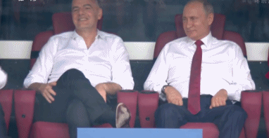 看台上的因凡蒂诺与普京 开场后两队都比较谨慎,克罗地亚在控球方面稍占优势。第7分钟,克罗地亚获得全场第一个角球机会,不过未能制造出威胁。第11分钟,拉基蒂奇长传球制造杀机,但佩里西奇没有停好球,错失一次机会。