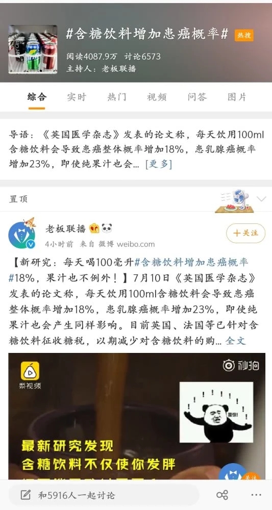 《英国医学杂志》发表的论文称,每天饮用100ml含糖饮料会导致患癌整体概率增加18%,患乳腺癌概率增加23%。中国食品辟谣联盟专家表示:该实验的结果是一种通过队列研究而得到的观察研究结果,只能表明含糖饮料与患癌存在相关性,但并不代表存在因果关系。
