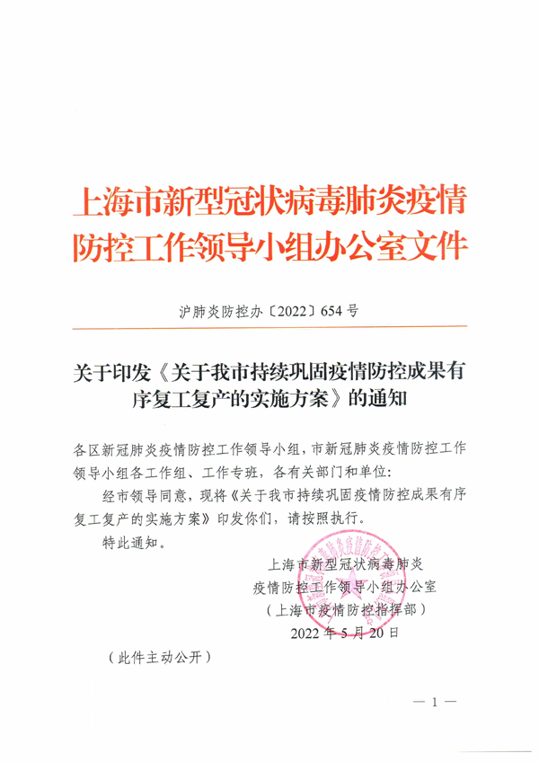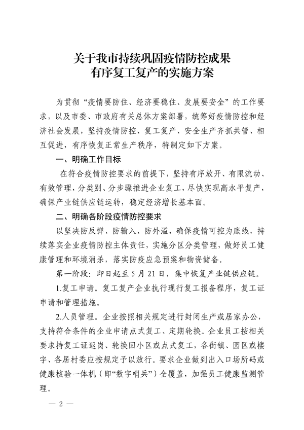 关于我市持续巩固疫情防控成果有序复工复产的实施方案