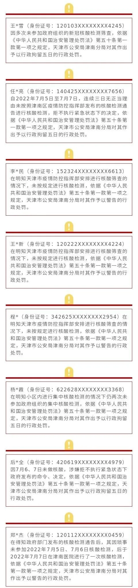 近日,在天津市部分区域组织的全域核酸检测中,有个别人员未按时参加核酸筛查,给疫情防控带来风险。据不完全统计,河东区有14人无故不参加筛查被训诫并责令补测,西青区有123人被训诫,津南区有8人被拘留或警告,并由有关部门纳入个人诚信记录。日前,“信用天津”曝光了部分人员的失信情况。
