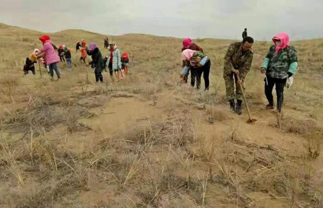 工人在白芨滩植树。(受访者吴敬忠 供图)