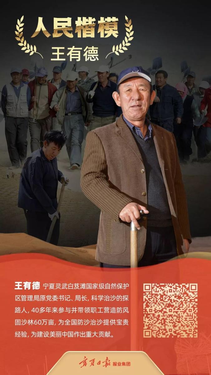 ![]() 9月29日上午,中华人民共和国国家勋章和国家荣誉称号颁授仪式在人民大会堂隆重举行,以国家之名、以最高规格褒奖英雄模范。宁夏灵武白芨滩国家级自然保护区管理局原党委书记、局长王有德被授予“人民楷模”国家荣誉称号。 王有德,人民楷模,科学治沙的探路人,40多年来参与并带领职工营造防风固沙林60万亩,为全国防沙治沙提供宝贵经验,为建设美丽中国作出重大贡献。 ![]()