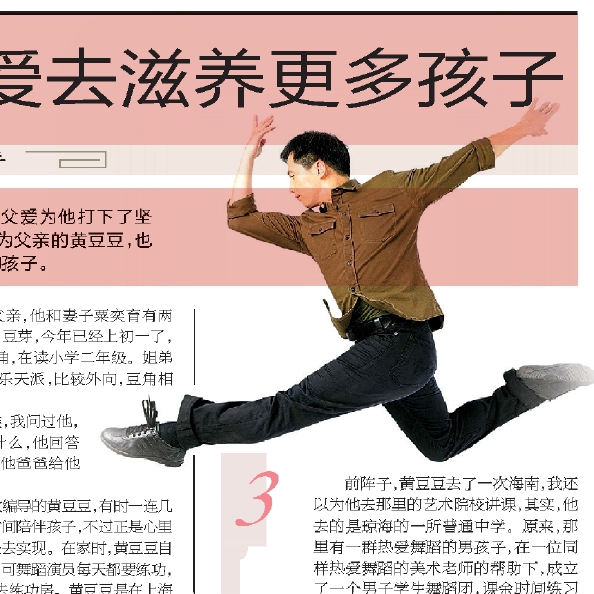 ◆简平 在黄豆豆的人生初始,父爱为他打下了坚实的人生基石,而如今已成为父亲的黄豆豆,也用他的那份爱滋养着更多的孩子。 1 豆豆和他的爸爸 随着时间的流逝,许多记忆会渐渐模糊起来,但也总有一些如同定格的照片,清晰难忘。那是2000年5月,黄豆豆的舞蹈专场公演前夕,他原先的腿伤突然加重了,我得知消息后去看望他。那时,他住在靠近西郊动物园的一幢公寓的四楼,那是六层楼的房子,没有电梯。我进门后,正好看到黄豆豆的爸爸在给他的膝盖处绑绷带——黄豆豆坚持要在所有演出都完成后再去瑞金医院动手术。只见黄豆豆的爸爸蹲着身子,每绑一层都会抬眼看看黄豆豆的反应,怕弄疼他,大概是紧张吧,额头都沁出了汗来。这幕情景令我很是感动。 那时候,黄豆豆23岁,从北京舞蹈学院毕业后在上海歌舞团工作快四年了。由于平时排练辛苦,还是单身的黄豆豆在生活方面过得相当粗糙,而且也从来没和父母说过自己的腿伤,因为他知道,父母听后就会跟他讲,这很正常啊,不受伤不受痛怎么练得好舞蹈呢。其实,他不知道,父母嘴上这么说,心里哪会放得下。这不,黄豆豆的爸爸决定不再工作,专门从温州来上海照顾他。 说起来,黄豆豆的爸爸是在上海出生的,名字叫黄沪。虽然后来他在温州成家立业,但对上海一直乡情浓郁。我曾问过他,黄豆豆连考三次北京舞蹈学院附中都失败,直到12岁那年才被上海舞蹈学校录取,作为父亲,他当时是怎么想的。黄爸爸说他对上海充满感激,相信自己的故乡一定会给他的孩子打开广阔的发展空间。他叮嘱黄豆豆:“你要学会笨鸟先飞,你的先天条件不够好,也不像别人那么聪明,只能靠自己多练、苦练,起床比别人早,练功比别人勤,吃苦比别人多!”黄爸爸离沪时,背对不断向他挥手的黄豆豆,走了好远,才掉下不舍的眼泪。 黄豆豆的爸爸来上海后,把日常生活中的全部琐事都一个人扛了下来,每天忙得一刻不停,既是“保姆”,又是“护工”,还是“大厨”和“信件收发人”,让黄豆豆得以全身心地投入到练功、排演中,得以细细地去理解、体会、创造角色。爸爸确实是黄豆豆最为可靠的“保障”。舞蹈演员体力消耗大,有了伤病后也就是贴贴膏药,做做电疗,可黄豆豆的爸爸却想着法子通过食疗、推拿、拔罐等帮黄豆豆减轻伤痛。他做的饭菜非但可口,还考虑到营养的均衡;他反复训练手法,将推拿、按摩做到位。同时,他还是一个“助理教练”,别看他是一家工厂的职工,在温州也是个响当当的业余舞蹈演员,编排演出的节目拿过不少奖呢,所以他经常给黄豆豆做提示讲解,告诉他不仅舞姿要美,还要有内心的情感。如今,每当黄豆豆回忆起那些年的日子,都会生出许多的感慨,要是没有他爸爸的这种奉献和付出,他不可能在短短的几年里演了那么多的舞剧,还走上了编导的道路,成了一名创作型舞者。 2012年夏天的一个晚上,黄豆豆的爸爸因病去世了,我非常痛心,他还不到65岁呢。稍感宽慰的是,黄爸爸生命中的最后几天,黄豆豆一直陪伴在他身边,他还握着爸爸的手告诉他,从医院大楼的窗口看出去,可以看到他们家曾住过很长时间的墨池坊的片片瓦背。 2 豆豆和他的一双儿女 黄豆豆如今也是一位父亲,他和妻子粟奕育有两个孩子,大的是女孩,小名叫豆芽,今年已经上初一了,小的是男孩,家人管他叫豆角,在读小学二年级。姐弟俩的性格不太一样,豆芽属乐天派,比较外向,豆角相对来说细腻一点、敏感一点。 黄豆豆刚有孩子的时候,我问过他,对于孩子最想做的事情是什么,他回答说:“陪伴。”我想,这也许是他爸爸给他的精神启示吧。 其实,经常在外演出或做编导的黄豆豆,有时一连几个月都不在家,所以很少有时间陪伴孩子,不过正是心里有这份意念,他便会想方设法去实现。在家时,黄豆豆自觉与妻子分担带孩子的任务,可舞蹈演员每天都要练功,那怎么办呢?他便带着孩子去练功房。黄豆豆是在上海芭蕾舞团的练功房练功的,上芭的辛丽丽团长非常理解他,常常是黄豆豆练着功,孩子坐在练功房的大镜子下,一边听钢琴一边看大人们练功。一开始是豆芽,豆芽大了,就换成了豆角。豆芽六七岁时,有一天,大人练功结束了,但她却不肯走,跟黄豆豆说,她想把小天鹅的裙子穿在自己身上,看看是什么样子的,然后又去拿了一双放在角落里的脚尖鞋,自己把脚套了进去,当她扶着把杆站立起来时,一下子叫了起来:“爸爸,怎么这么疼啊?”她这才知道原来跳芭蕾舞时将脚尖立起来会这么疼痛。 黄豆豆小时候亲眼见过爸爸妈妈在舞台上跳舞,这给他留下了非常深刻的印象,所以,他也希望自己的孩子能记住他跳舞的样子。有一次,他演出独舞《庄周梦》时,让妻子带着两个孩子去剧场观看。舞蹈的伴奏音乐是乐队在现场演奏的,是一首大提琴协奏曲。第二天,他问孩子看了演出有什么感受,让他很意外的是,豆芽说那个音乐里面的大提琴太好听了,她也想学。于是,在一个下着雨的傍晚,黄豆豆和上海爱乐乐团的大提琴首席吴敏喆带着豆芽去一家琴行,给她挑了一把小小的大提琴。豆芽开始每天练琴,但就是找不到音准。几个月后,黄豆豆出差回家,还没进家门,就听见屋子里传出来的琴声,豆芽终于把音阶给拉出来了,这一刻,他欣喜万分。他倒是没有想过将来让孩子去学大提琴专业,他觉得孩子能把一样乐器当成是兴趣爱好就足够了。 这两年黄豆豆一直在北京学习,家庭的