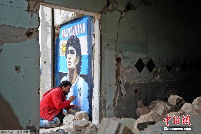 11月26日,叙利亚西北部伊德利卜省宾尼什镇的废墟上,叙利亚画家阿齐兹·阿斯玛(Aziz Asmar)正在为逝世的“球王”马拉多纳画像。