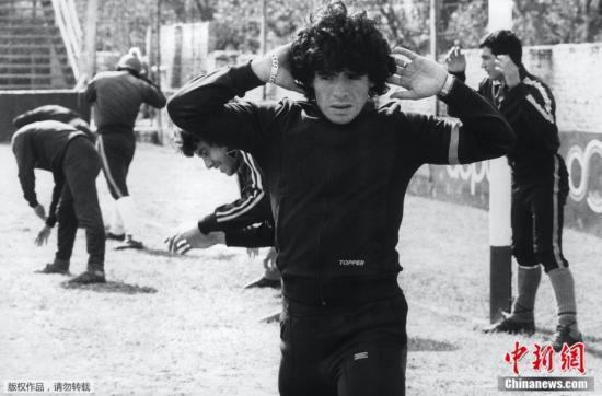 资料图:1977年9月12日,阿根廷布宜诺斯艾利斯,年仅16岁的马拉多纳在比赛场边热身准备登场。