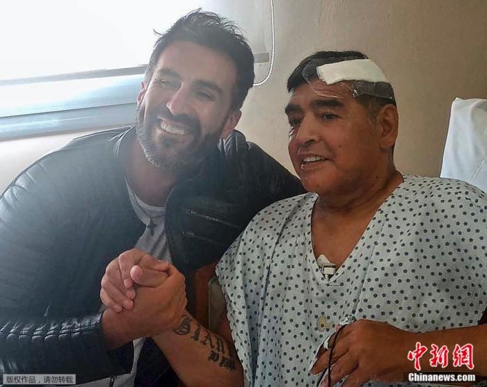 当地时间2020年11月11日,与他的私人医生合影。马拉多纳因贫血、脱水和抑郁而入院治疗。随后,核磁共振显示他有硬脑膜下血肿。随后,现年60岁的阿根廷足球巨星接受了脑部手术。