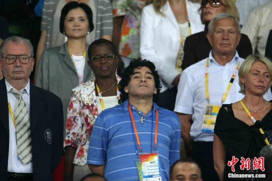 资料图:2008年8月19日,北京奥运会男足第二场半决赛在北京工人体育场举行,球王马拉多纳到场观看巴西、阿根廷遭遇战。中新社记者 任晨鸣 摄