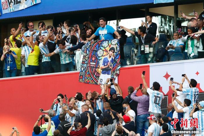 2018年6月26日,2018俄罗斯世界杯D组阿根廷与尼日利亚的“生死战”在圣彼得堡打响,马拉多纳现身球场观战。中新社记者 富田 摄