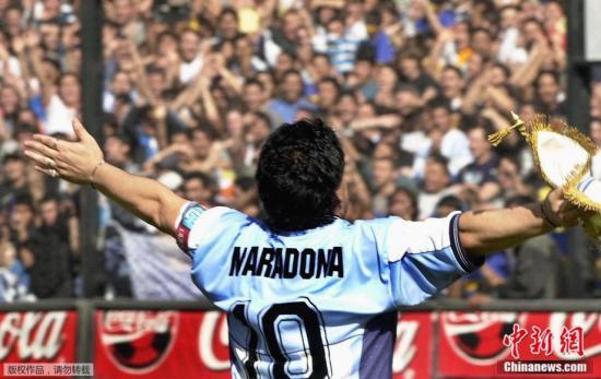 资料图:2001年11月10日,马拉多纳在个人告别赛上向球迷致敬。
