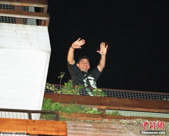 资料图:1997年10月30日晚,马拉多纳在布宜诺斯艾利斯公寓的阳台上向球迷和记者挥手致意。此前他在接受一个电视节目的电话采访时宣布退役。