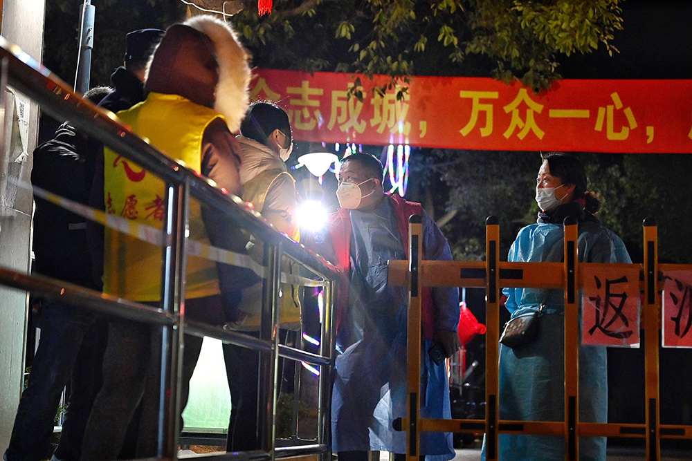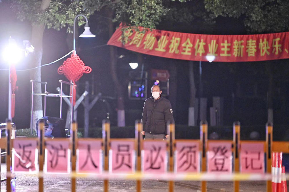2021年2月18日晚十点五十,上海市浦东新区新高苑,小区内的居民在门口等待着小区解封。