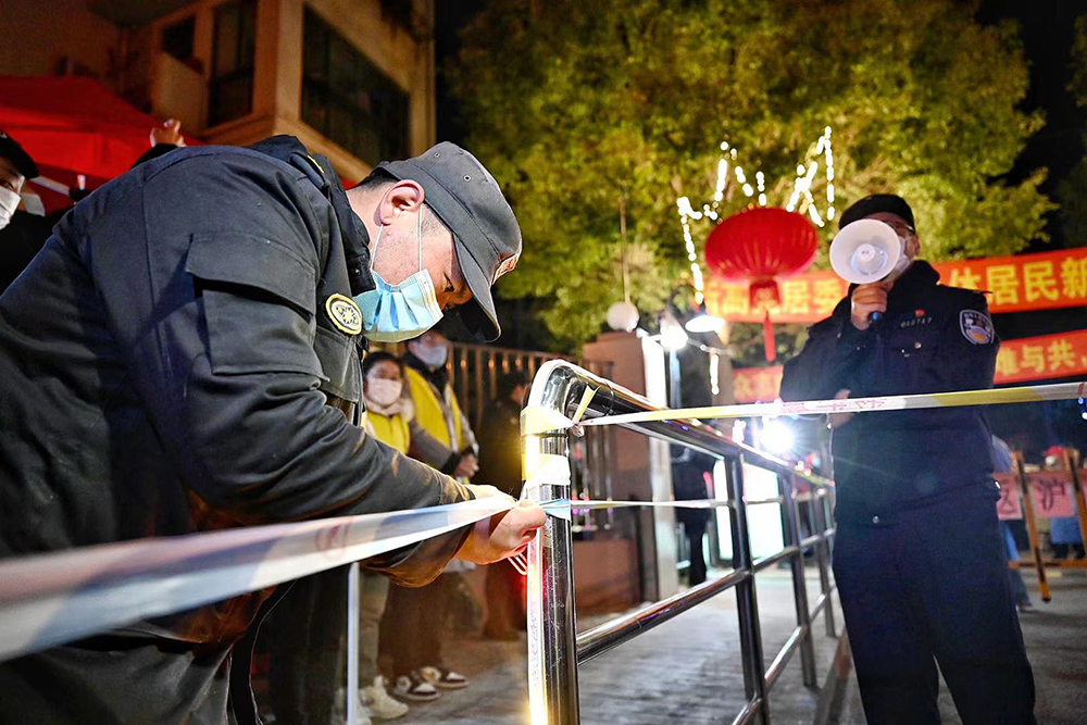 2021年2月19日零时,上海市浦东新区新高苑,保安将警戒线解除。