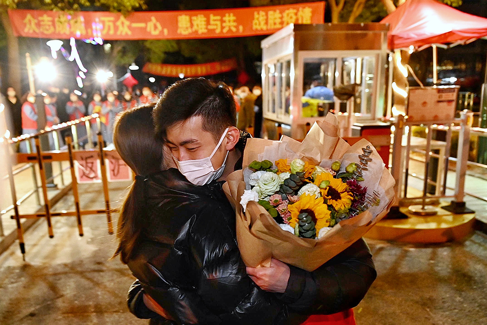 2021年2月19日,上海市浦东新区新高苑,黄思杰与前来送花的老婆相拥。新高苑封闭期间,在高东镇镇政府工作的黄思杰在新高苑内做志愿者。