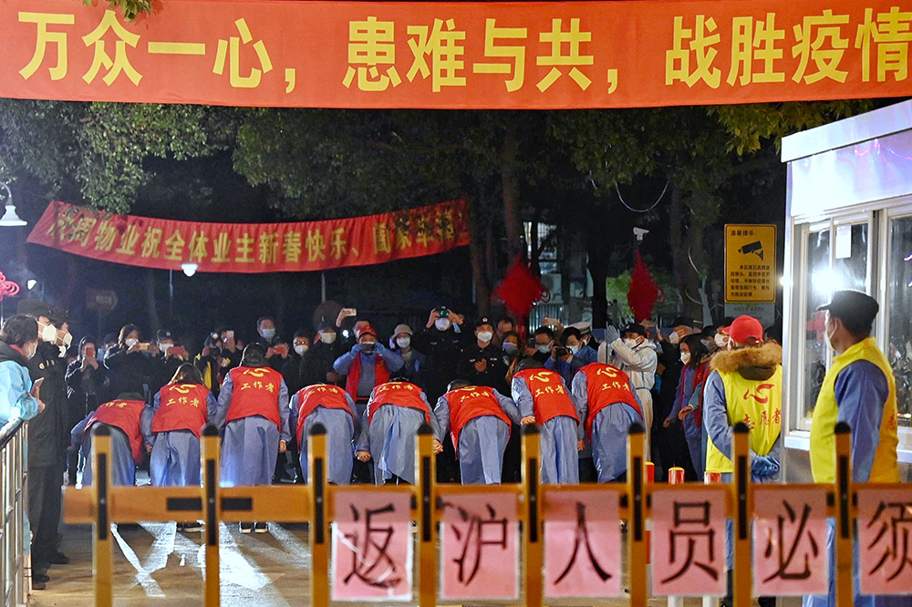 2021年2月18日,上海市浦东新区新高苑,小区内的志愿者向居民鞠躬致谢,感谢他们这些天的配合和理解。