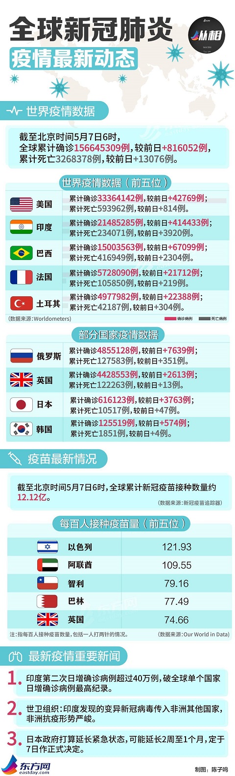 连日来,印度疫情进一步加剧。 根据印度卫生部6日数据, 过去24小时内该国新增确诊病例达到412262例,新增死亡病例3980例,相当于平均每分钟新增确诊超280例,新增死亡病例两例以上。 受印度疫情影响,非洲大陆的抗疫形势陡然严峻。据世卫组织非洲区域主任莫提6日介绍,在印度首先发现的变异新冠病毒传入非洲一些国家,此外因印度产新冠疫苗订单交付延迟,使非洲大陆面临第三波疫情反弹的风险。 根据Worldometer实时统计数据,截至北京时间5月7日6时,全球累计确诊新冠肺炎病例超过1.56亿例,累计死亡326万例;全球累计新冠疫苗接种数量约12.12亿。 ![]() 俄罗斯推出单剂疫苗,有效率达到79.4% 俄罗斯直接投资基金5月6日表示,俄罗斯已批准使用“卫星Light”(Sputnik Light)新冠病毒疫苗。该基金称,这种缩小版疫苗对新冠病毒的有效率为79.4%,每剂成本不到10美元。 该疫苗已指定用于出口,并可能增加部分免疫力人群的数量。此举可能有助于在感染率高的国家进一步供应疫苗。 据路透社报道,与与俄罗斯首款卫星五号疫苗相同,卫星Light疫苗是也由俄罗斯加马列亚流行病与微生物学国家研究中心研发。 英国追加投资研发针对变种病毒新疫苗 英国卫生部日前表示,该国将通过投资建设新的实验室设施来加速研发可应对变种冠病病毒的疫苗。 英国卫生部说,政府将额外投入2930万英镑来增加英格兰公共卫生局的检测设施,预计能让该机构每周检测的血液样本数量从700份提升至3000份,这些检测主要是评估疫苗诱导产生的抗体水平。借助这些新设施,研究人员能加快这类专业检测的流程,助力研发针对变种冠病病毒的疫苗。 印尼医疗公司职员在机场重复出售用过的鼻拭子棉签,近万旅客受影响 印尼机场曝出惊人消息。据CNN6日报道,印尼一家医疗公司职员被曝将使用过的鼻拭子棉签清洗后在机场重新出售,对往来机场旅客进行新冠鼻拭子检测。警方表示,目前已有5人被捕,有近1万名旅客受到影响,警方正在追踪这些旅客是否被感染。 涉事职员来自印度尼西亚主要制药公司基米亚·法玛,他们于4月27日被捕。警方表示,这5人涉嫌清洗和重新包装快速检测鼻拭子套件,并将其出售给往来北苏门答腊棉兰瓜那木国际机场的乘客。 由于印尼当地机场要求乘客在登机前持冠病检测阴性证明,因此许多乘客选择支付13美元,购买一个快速检测试剂盒来检测。 嫌疑人将使用过的检测工具清洗后再次销售。通过这一手法,他们获利12.4万美元(约80万元人民币)。 根据印尼卫生法,这些嫌疑人如果被判有罪,最高可判处10年监禁。根据该国消费者保护法,最高可判处5年监禁。 美国支持暂时豁免新冠疫苗知识产权 美国贸易代表戴琦5日表示,为应对新冠疫情,美国政府支持暂时豁免与新冠疫苗相关的知识产权保护。美方将积极参与世贸组织举行的相关文本谈判以促成上述目标,但“谈判需要时间”。 ![]() 此前,美国政府一直面临国内外有关豁免新冠疫苗知识产权保护的呼声,此次迫于压力转变态度,也招致疫苗研发企业的不满。 美国药物研究机构和制药厂商协会当天发表声明说,此举将进一步削弱承压的供应链,促进“假冒疫苗”的扩散,同时无法真正解决实现更多疫苗接种的挑战,包括“最后一英里的分配和有限的原材料供应”。 当前不少中低收入国家仍面临疫苗短缺的困扰。世卫组织总干事谭德塞呼吁暂时豁免新冠疫苗知识产权,以尽快提高全球疫苗产能。欧盟、英国、日本、瑞士等发达经济体一直持反对立场。 印度老人新冠离世,火化时女儿跳入火堆 近日,印度拉贾斯坦邦发生一起悲剧事件,一名34岁妇女的父亲感染新冠后死亡。这名女子在父亲火化时跳进燃烧的柴堆,导致严重烧伤。 ![]() 73岁的沙达4日因感染新冠,在医院去世。他三个女儿中的小女儿钱德拉,坚持要去火葬场送父亲最后一程。当沙达遗体被火化时,钱德拉沙达突然跳进了燃烧的柴堆。尽管最终她被周围的人救了出来,但全身约70%的面积被烧伤。 目前,印度疫情持续蔓延,卫生部5月6日通报显示,过去24小时,该国新增新冠病例412262例,新增死亡3980例,皆创下单日新高。 印度政府首席科学顾问拉加万5日表示,鉴于目前该国新冠病毒传播水平居高不下,印度将不可避免第三波疫情。拉加万称,虽然还不清楚第三波疫情发生的时间和规模,但印度政府应为此做好准备。 马来西亚包机从印度撤侨 马来西亚外交部长5月6日正式对外公布,由于印度的疫情日益严重,政府决定撤离旅居印度北部和西部的马国公民。这是印度出现新一波疫情以来,马来西亚首次宣布从印度撤侨 马来西亚外交部长在社交媒体上表示,当局将撤离的马国公民包括各机构和公司的外派人员及其家属。他说,政府将使用特别包机将他们带回马国。“我必须强调,这是由多个相关方作出的决定。” 塞尔维亚将用现金奖励疫苗接种 据法新社5日报道,塞尔维亚总统武契奇当日表示,将向5月底前接受新冠疫苗接种的每一位公民支付费用,这或许是世界上首个实施现金换接种计划的国家。 ![]() 据报道,塞尔维亚向国外订购了数百万剂疫苗。塞尔维亚700万人口中已经有150万人接受了两剂疫苗接种,不过,在此之后,接种人数增加缓慢,几乎停滞。 武契奇对当地媒体表示:“所有在5月31日之前接种疫苗的人将得到3000第纳尔(约198元人民币)的现金,”他补充说,他预计到本月底将再有