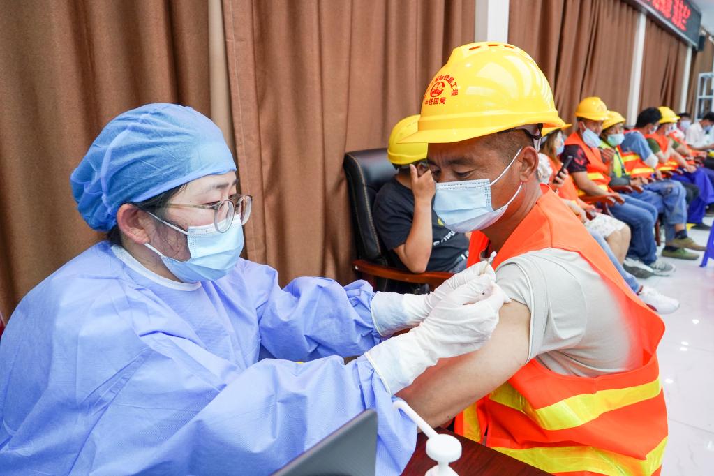 2021年6月8日,江苏南京,在中铁四局江苏南沿江城际铁路站前1标段施工项目驻地接种区,医务人员为工人接种新冠疫苗。新华社记者李博 摄