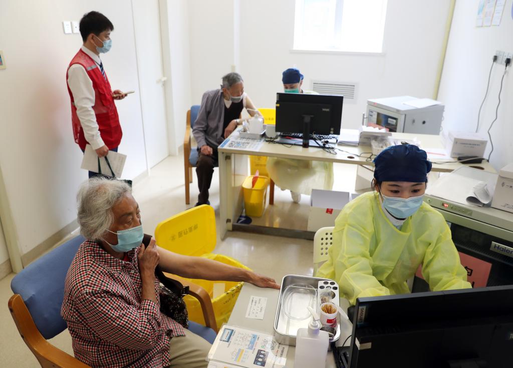 2021年5月18日,上海,长宁区新泾镇曙光居委会年过八旬的居民在上海交通大学医学院附属同仁医院“长者服务”专员的陪伴下,进入“长者接种专窗”接种新冠疫苗。新华社记者刘颖 摄