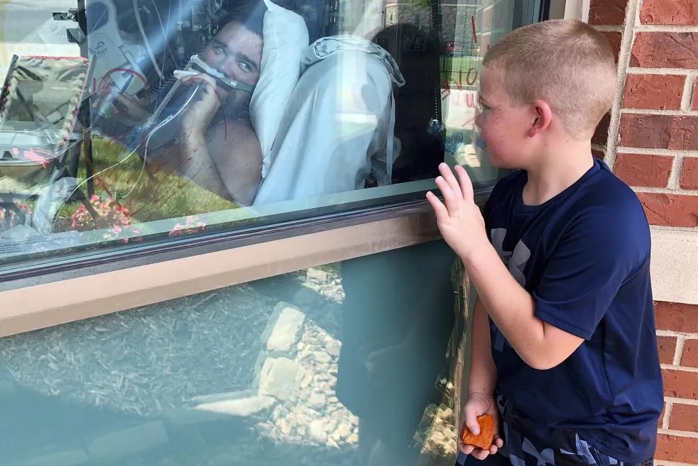 7月26日,密苏里州,六岁的布罗迪·巴克在他的病房外隔窗向他的父亲达里尔打招呼。图源:AP