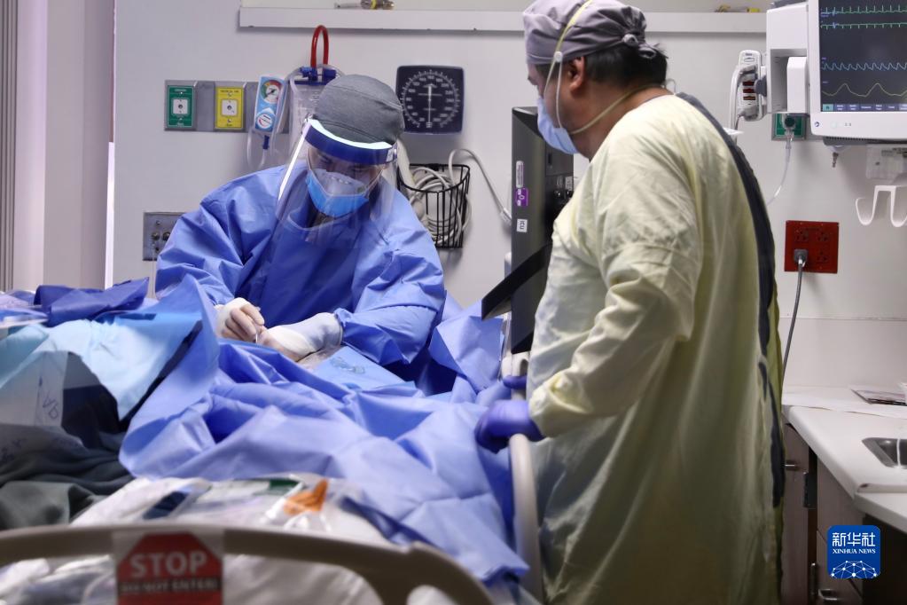 这是1月22日,在美国加利福尼亚州蒙特贝洛市贝弗利医院,医护人员在“新冠病区”治疗病人。新华社发